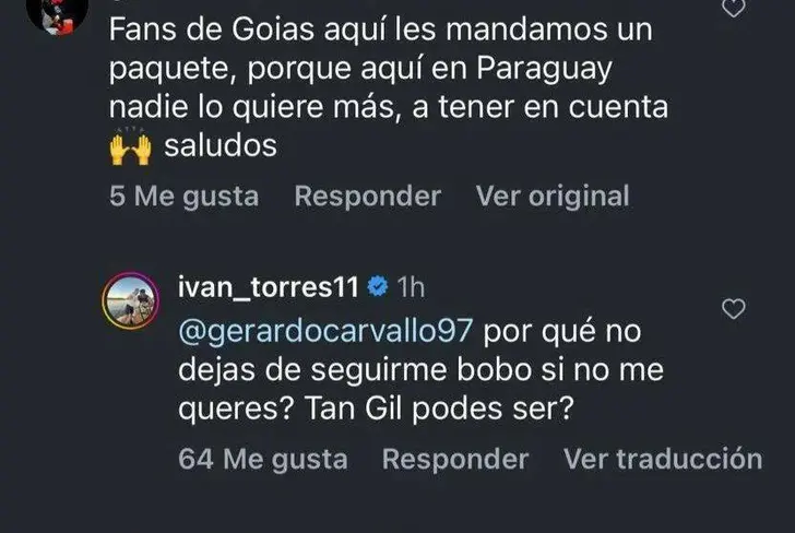 Un aficionado le escribió: 'Fans de Goiás, aquí les mandamos un paquete, porque aquí en Paraguay nadie lo quiere más, a tener en cuenta, saludos'; a lo que Torres contestó: 'por qué no dejas de seguirme si no me queres? tan gil podes ser?', lo que generó una ola de comentarios y que su respuesta se haya viralizado rápidamente.