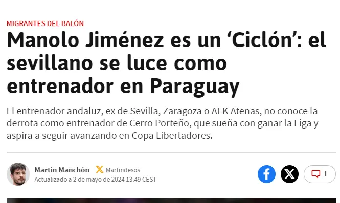 El diario AS tituló: "Manolo Jiménez es un 'Ciclón': el sevillano se luce como entrenador en Paraguay", debido a sus grandes números como entrenador del conjunto azulgrana.