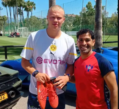 Tras la coincidencia de la llegada de Haaland en Málaga, varios integrantes del staff tuvieron la oportunidad de tomarse una foto con él, entre ellos el preparador físico Gustavo Ibarra a quien se lo vio feliz por el momento especial con una de las figuras del mundo.