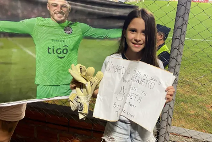 Esto pasó con el arquero uruguayo y máxima figura de Olimpia, Gastón Olveira quien vio que una pequeña fanática se tomó el esfuerzo de imprimir su fotografía en un cartel enorme pidiendo la camiseta del uruguayo.