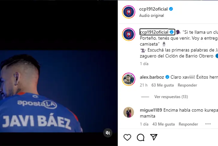 Pero la ilusión volvió precisamente con la presentación de Javier Báez en la cuenta oficial de Cerro Porteño en Instagram, donde Alexander Barboza apareció y comentó el posteo escribiendo: 'Claro Xavi, éxitos hermano'.