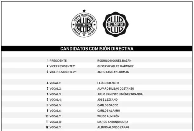 La lista la encabeza el futuro presidente Rodrigo 'Coto' Nogués teniendo como vicepresidentes a Gustavo Volpe y Jairo Yambay mientras que los tres primeros vocales serán Federico Zichy, Álvaro Bilbao y Julio Jiménez.