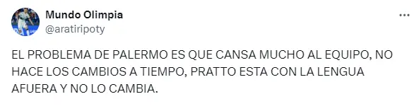 Por su parte, los hinchas de Olimpia están molestos con el entrenador Martín Palermo debido a que no le da muchos minutos al extremo ofensivo Carlos Arrúa desde su llegada.