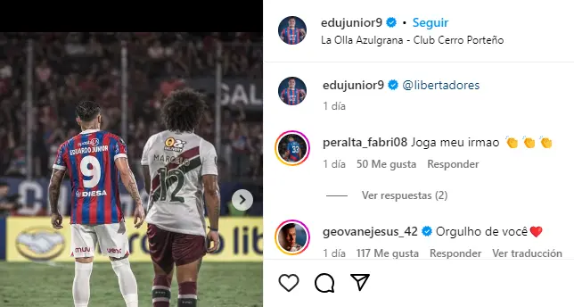 El propio brasileño de Cerro Porteño, Eduardo Nascimiento, el popular Edú Junior posteó una publicación en su cuenta personal de Instagram con su compatriota Marcelo.