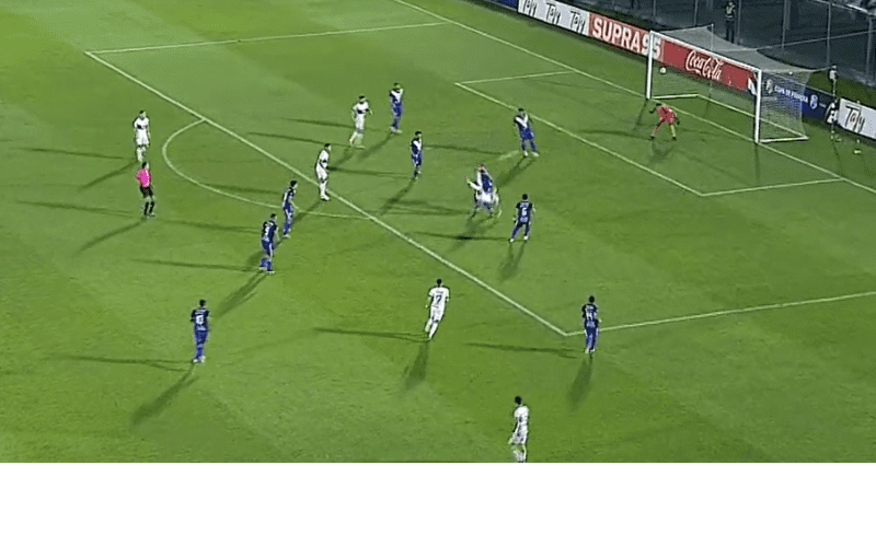 El remate impactó primeramente en la base del poste inferior derecho para finalmente colarse en la red para darle más espectacularidad a la jugada y al tanto anotado por Paiva, que llegó a su tercera anotación en la competencia casera.