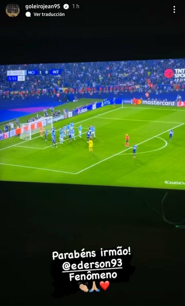 De brasileño a brasileño y de arquero a arquero, Jean Fernandes subió una foto observando el partido y enviando un mensaje a Ederson, portero titular del City.