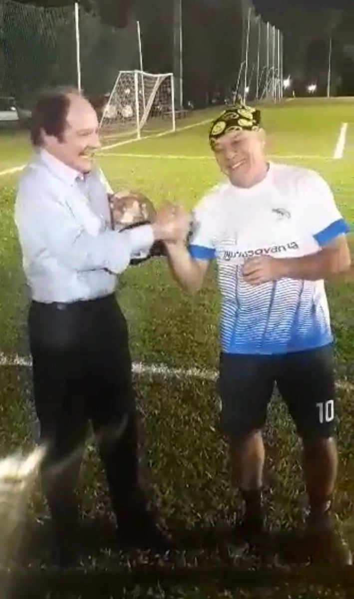 En un ameno encuentro con el directivo Óscar Vicente Scavone, el Loco González se acercó hasta su oficina para entregarle ese balón histórico al famoso colaborador olimpista.