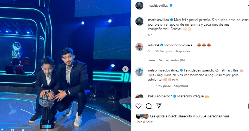 Villasanti asistió a la ceremonia de premiación y mostró con orgullo su premio en sus redes sociales donde en Instagram agradeció a su familia y compañeros del Gremio por el trofeo.