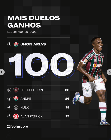 Según el estudio estadístico de la agencia internacional Sofascore, en la tabla de los duelos ganados a lo largo de toda la competencia, el primero de la lista es el delantero colombiano del campeón, Jhon Airas con un 100% de efectividad.