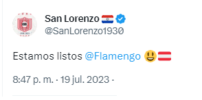 Admitiendo la humildad del propio club, la cuenta de twitter escribió: ‘Estamos listos Flamengo’, con un emoji de una carita feliz y la bandera santa, en alusión al próximo rival en Copa Libertadores que tendrá el franjeado.