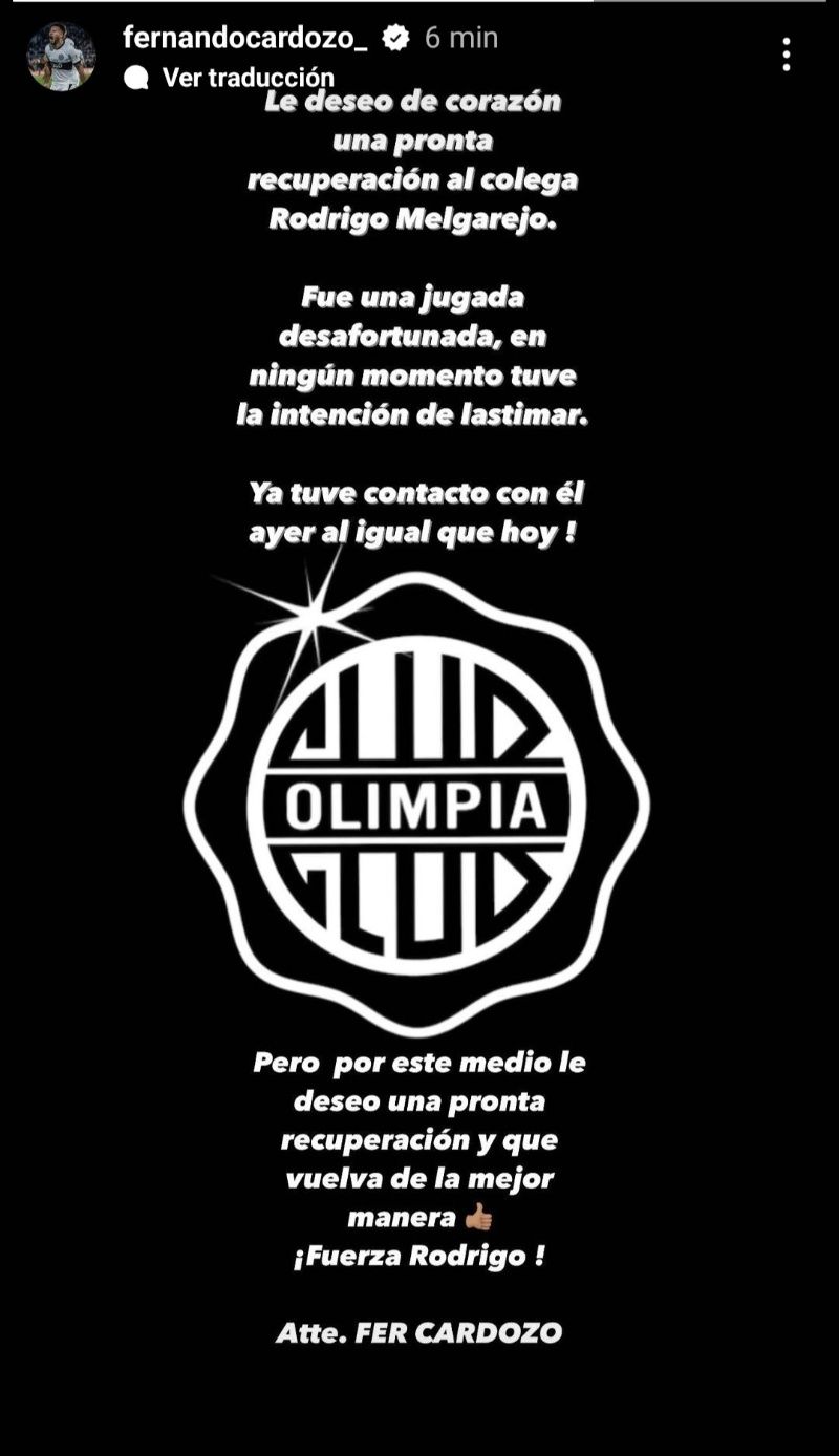 Muchos hinchas de Cerro Porteño culparon a Cardozo por la manera en que disputó el balón pero el futbolista se descargó en su cuenta de Instagram: 'Le deseo de corazón una pronta recuperación al colega Rodrigo Melgarejo. Fue una jugada desafortunada, en ningún momento tuve intención de lastimar. Ya tuve contacto con él ayer al igual que hoy. Por este medio le deseo una pronta recuperación y que vuelva de la mejor manera ¡Fuerza Rodrigo! Atentamente Fernando Cardozo'.