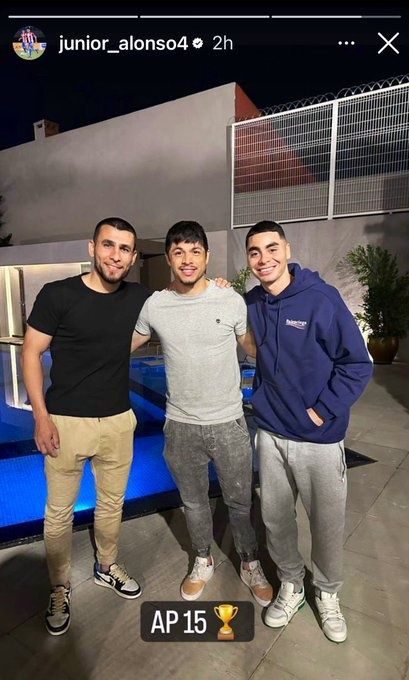 En la fotografía se ve a Junior posando con Rodrigo Rojas y Miguel Almirón, compañeros suyos de aquel título, además tenía la inscripción AP15, en relación al torneo y al año de aquella gloria.
