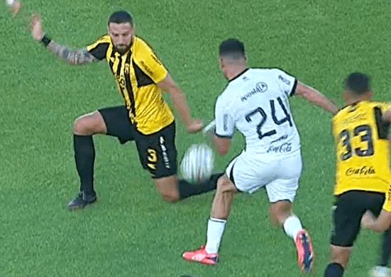 La polémica se instaló cuando el VAR llama al juez y le muestra una sola toma donde aparenta que la pelota va a la mano de Carlos Moyá, defensor de Guaraní. Sin mostrar otro ángulo, el árbitro pita penal.