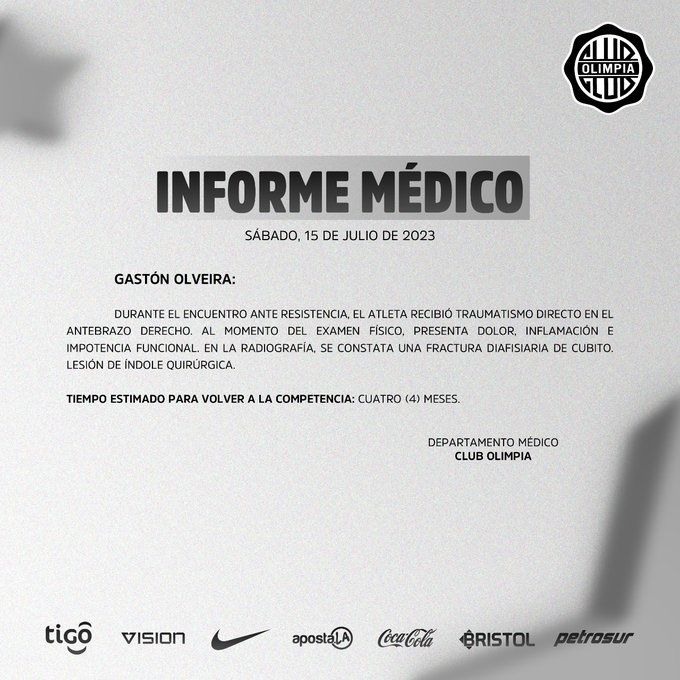 Específicamente, el informe reza: ‘El atleta recibió traumatismo directo en el antebrazo derecho. En la radiografía se constata una fractura diafisiaria de cúbito, lesión de índole quirúrjica. Tiempo de recuperación: cuatro meses’.