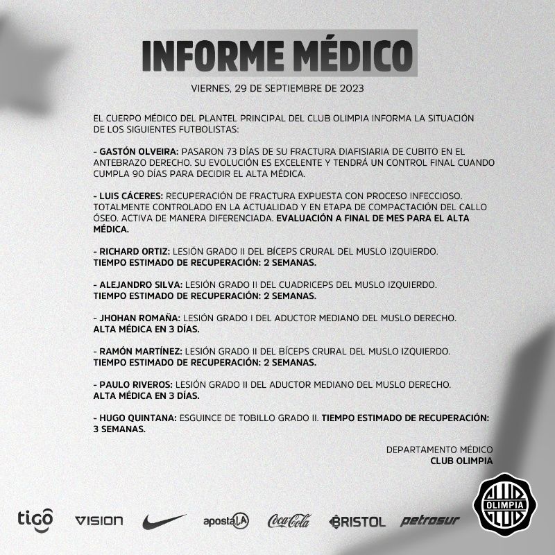 La cuenta oficial de Olimpia emitió un extenso comunicado donde rezaba las situaciones de Richard Ortiz, Alejandro Silva, Johan Romaña, Gastón Olveira, entre otros tantos jugadores como algunos juveniles.