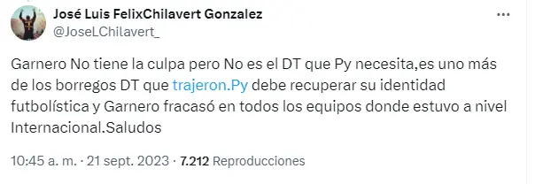 Siempre picante y sin pelos en la lengua, José Luis Chilavert escribió en su cuenta de Twitter/X: "Garnero No tiene la culpa pero No es el DT que Py necesita,es uno más de los borregos DT que trajeron. Py debe recuperar su identidad futbolística y Garnero fracasó en todos los equipos donde estuvo a nivel Internacional.Saludos".