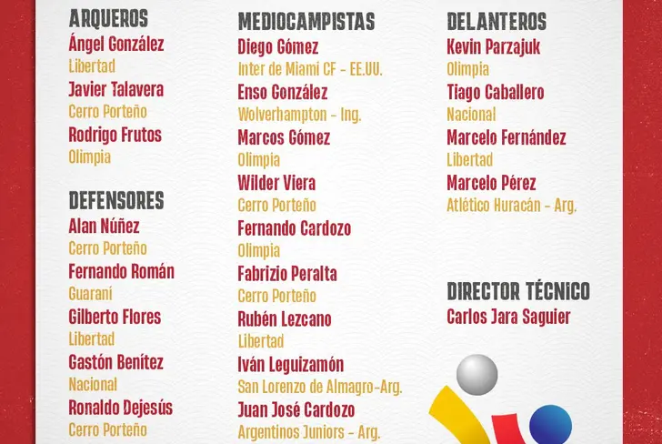 Los mediocampistas son Diego Gómez del Inter Miami, Enso González del Wolverhampton, Marcos Gómez, Wilder Viera, Fernando Cardozo, Fabrizio Peralta, Rubén Lezcano, Iván Leguizamón de San Lorenzo de Almagro y Juan José Cardozo de Argentinos Juniors de manera sorpresiva.