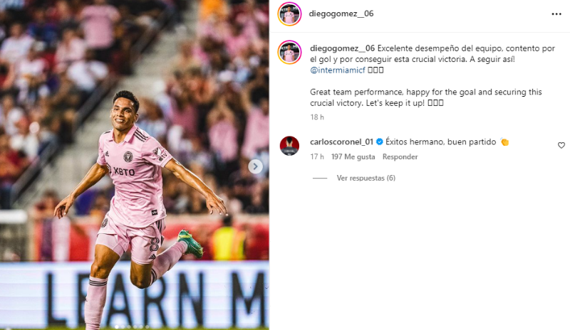 Más tarde, Gómez publicó un par de fotos del compromiso en su cuenta de Instagram donde el propio arquero a quien le convirtió le envió un mensaje de apoyo. Coronel escribió: ‘Éxitos hermano, buen partido’.
