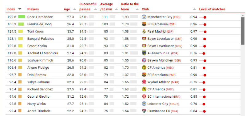 La lista se elabora en base a los jugadores que disputaron un mínimo de 450 minutos en las diferentes ligas de sus clubes y se evalúa cantidad de pases, cantidad de pases precisos y situaciones generadas al arco rival.