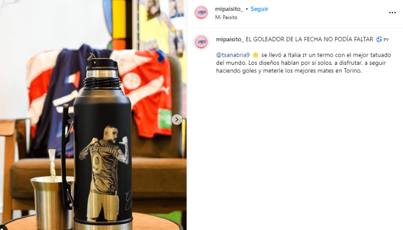 Ahora, de vuelta al Torino, se llevó un termo de mate totalmente personalizado por parte de una empresa paraguaya que obsequió por haber marcado el tanto.