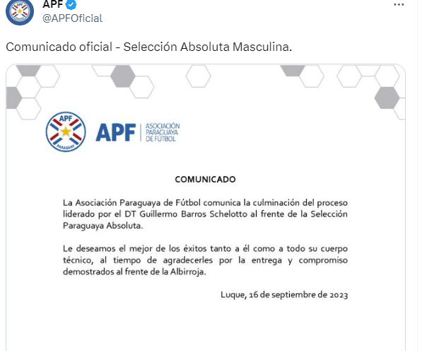 Era cuestión de horas que se oficialice la información que ya se confirmó en la semana tras la derrota ante Venezuela y la igualdad de local ante Perú, Guillermo Barros Schelotto dejó de ser entrenador de la selección de Paraguay.
