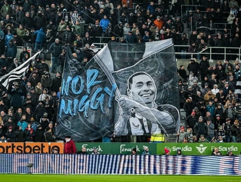 En una de las tribunas del St' James Park, apareció una bandera de grandes dimensiones con el rostro de Almirón sonriente, como es su principal característica, además un mensaje dirigido hacia Miggy.