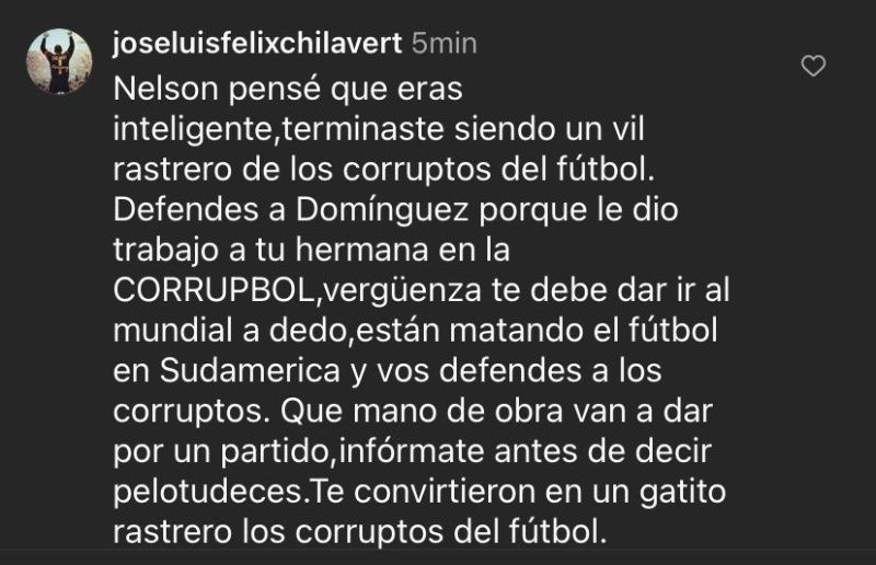 A esta publicación, el arquero José Luis Chilavert respondió de manera muy fuerte expresando su decepción al apoyo de Haedo al actual presidente de la Conmebol con palabras como: ‘Nelson pensé que eras inteligente, terminaste siendo un vil rastrero de los corruptos del fútbol’.