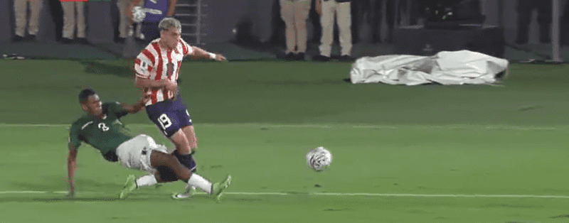 En un avance por el sector izquierdo, por el lado de Ramón Sosa, el atacante paraguayo cayó en el área rival donde en el primer golpe de vista dio la sensación que se podía haber cobrado penal pero finalmente no hubo infracción.