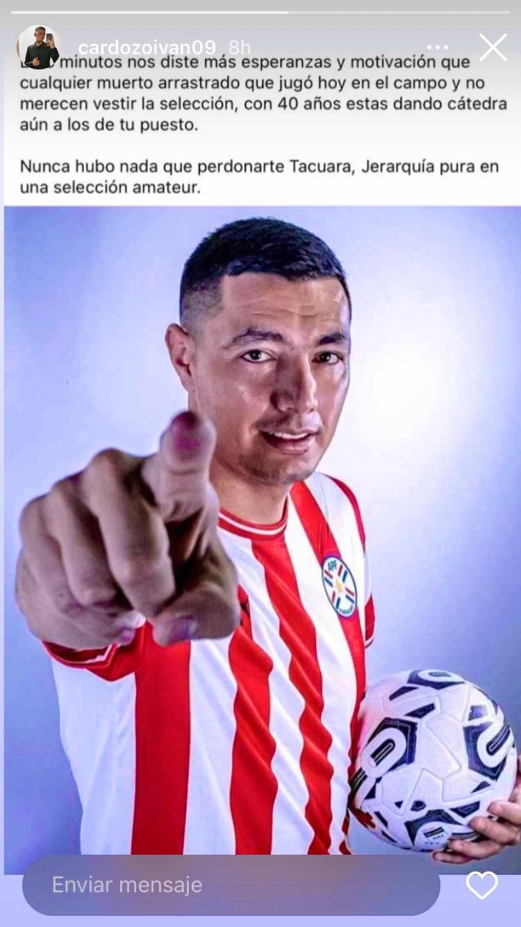 Iván Cardozo escribió en su cuenta de Instagram en la sección de historias: ‘En ocho minutos nos diste más esperanza y motivación que cualquier muerto arrastrado que jugó hoy en el campo y no merece vestir la selección. Con 40 años estás dando cátedra a los de tu puesto. Nunca hubo nada que perdonarte Tacuara. Jerarquía pura en una selección amateur’.
